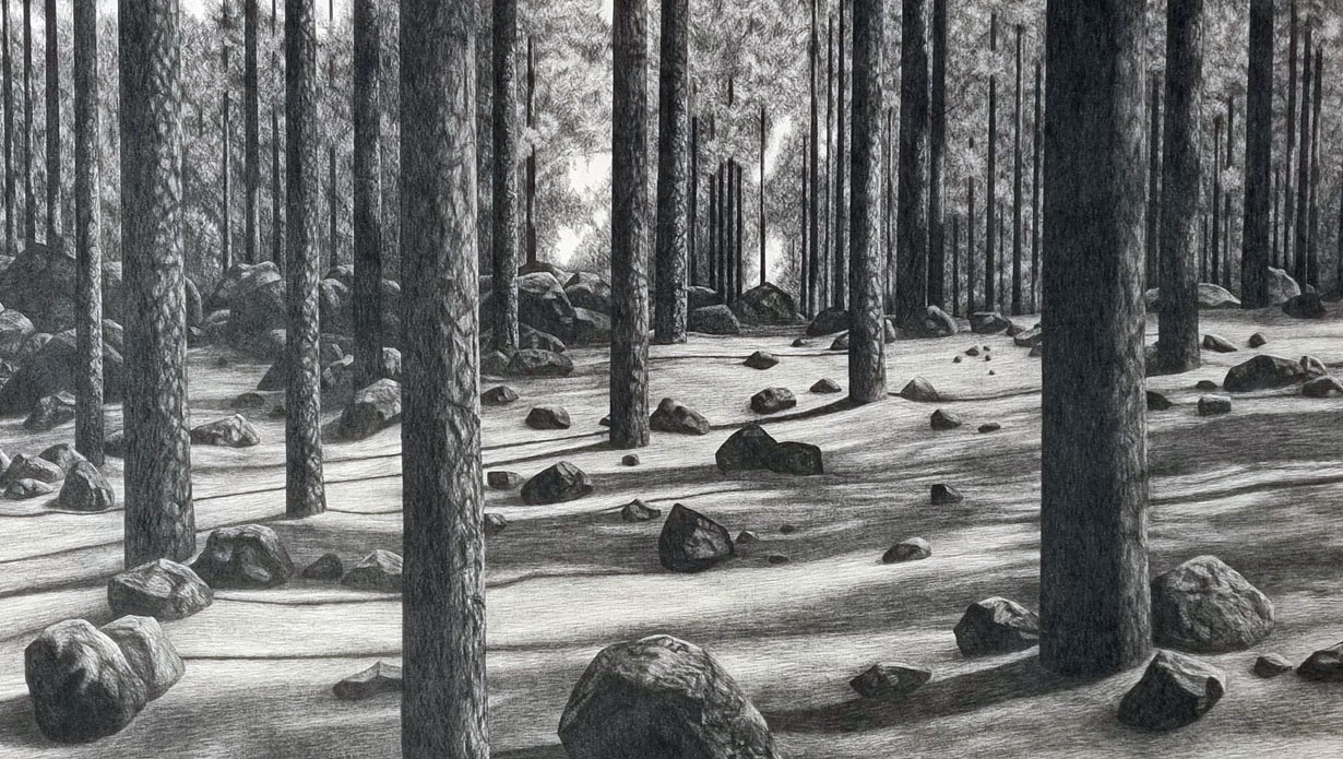 Working almost exclusively with pencil and graphite, on various surfaces, Julio draws and draws from nature as a source of inspiration. His methodology is simple and obstinate: He opaques the surfaces through the repetition of the essential graphic gesture, the line. A stroke always made with graphite accurately reflects the gradations of light and gives rise to forms that emerge from the opacity, from the totality of black, thanks to an exquisite organization of the surface established so that the reflection and the brightness of the external light finishes the work.