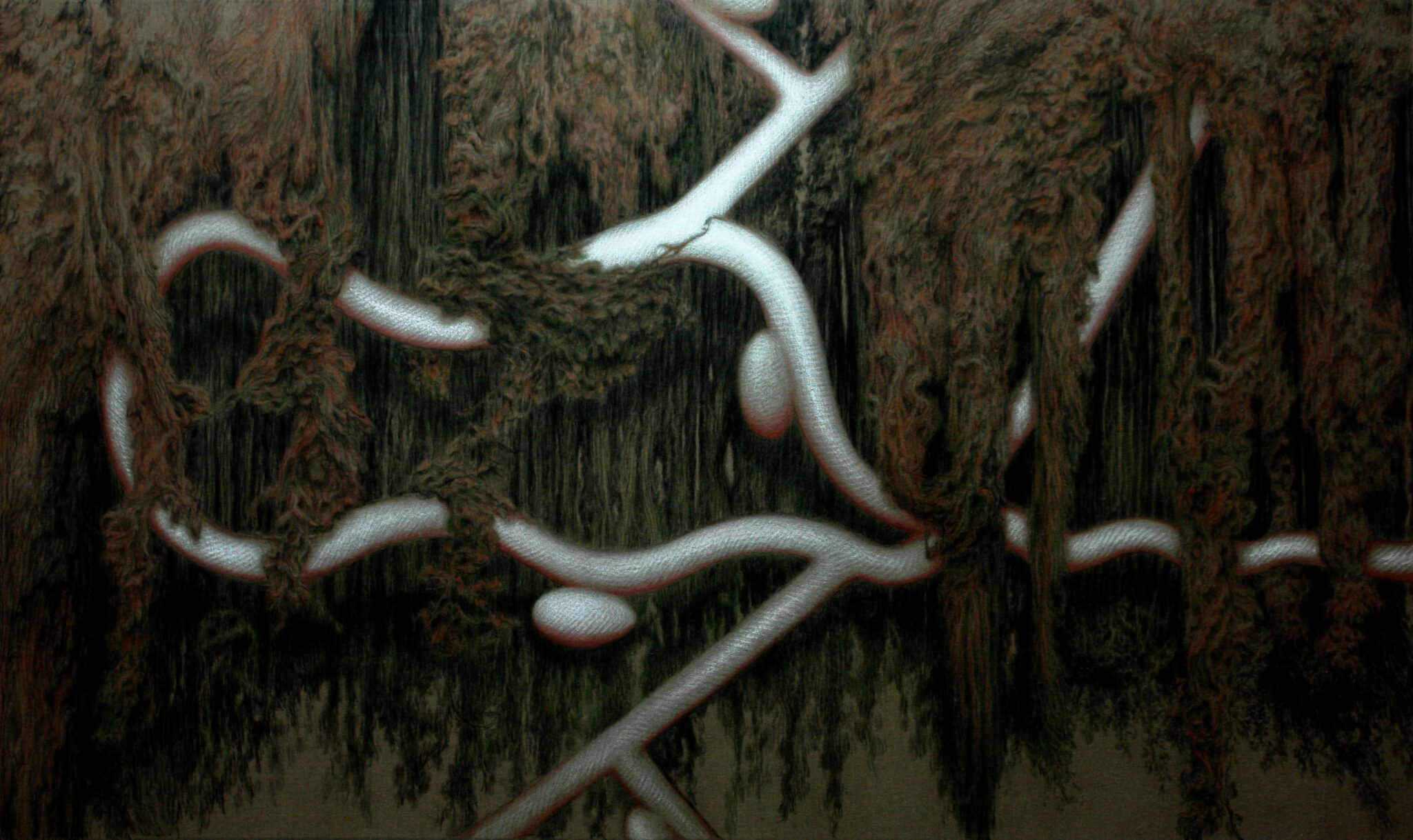 La espesura, la densidad de la vegetación del bosque se entrelaza hilando senderos orgánicos, paisajes desgarrados que deforman el tejido de las jerarquías. La espesura se convierte así en una imagen de la pérdida momentánea de identidad, o mejor dicho, un estado en el que el sujeto deja de situarse en el centro y pasa a formar parte de un sistema inmenso, fundiéndose con él.